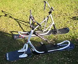 Le snowscoot est un engin composé d'un cadre, de deux planches différentes similaires à des snowboards, d'une fourche et d'un guidon pour orienter la planche avant.