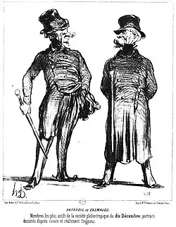 Dès l'automne 1850, Honoré Daumier a caricaturé pour Le Charivari les membres de la société du Dix-Décembre, présentés comme des brutes braillardes armées de gourdins. Le , il invente le personnage du colonel Ratapoil, que Jules Michelet considérera comme la personnification de « l'idée bonapartiste »[21]. Ce personnage-type a également été exploité par l'autre grand dessinateur du Charivari, Cham.