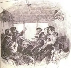 - En somme, il y a longtemps que la Mi-Carême n'avait attiré tant de monde sur les boulevards. Il y avait un assez grand nombre de déguisements : des pierrots, des polichinelles, des incroyables, des ours blancs, des femmes déguisées en hommes, des hommes déguisés en femmes, etc., tout cela circulant au milieu de l'ahurissement des cors de chasse et des cornets à bouquin. Les plus malins parmi le public ont pris l'impériale de l'omnibus de la Bastille à la Madeleine[32], d'où ils ont longuement dominé le spectacle de la foule immense.