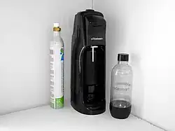 L'appareil SodaStream fabrique des boissons gazeuses par ajout de dioxyde de carbone, stocké sous pression dans un cylindre propriétaire. Outre la machine et la cartouche de gaz, l'ensemble est muni d'une ou plusieurs bouteilles réutilisables, mais ayant une date limite d'utilisation indiquée sur les bouteilles : il faut donc les remplacer en conséquence.
