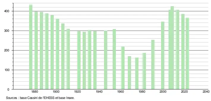 L'évolution du nombre d'habitants est connue à travers les recensements de la population effectués dans la commune depuis 1876. Pour les communes de moins de 10 000 habitants, une enquête de recensement portant sur toute la population est réalisée tous les cinq ans, les populations de référence des années intermédiaires étant quant à elles estimées par interpolation ou extrapolation[41]. Pour la commune, le premier recensement exhaustif entrant dans le cadre du nouveau dispositif a été réalisé en 2008[42].
