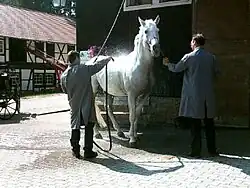 La douche est utilisée dans deux buts bien distincts : soit pour nettoyer, soit pour rafraichir. Elle ne peut être effectuée que lorsque les températures extérieures le permettent ou lorsque les installations sont équipées d'une douche chaude ou de lampes chauffantes. La priorité étant d'être capable de sécher l'animal avant de le rentrer au boxe. La douche la plus fréquente est la douche des membres qui permet de se débarrasser du sable et de la boue. Une douche intégrale sera utilisée ponctuellement et généralement associée à un shampoing. La douche utilisée pour rafraichir est, elle, très courte et doit uniquement se contenter d'humidifier l'animal. Une fois terminée, il faut passer un couteau de chaleur[Note 1] sur toutes les parties charnues ainsi que le ventre, et essuyer les membres avec une serviette[2].