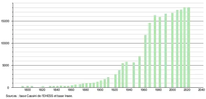 - ↑ Par convention dans Wikipédia, le principe a été retenu de n’afficher dans le tableau des recensements et le graphique, pour les populations de référence postérieures à 1999, que les populations correspondant à une enquête exhaustive de recensement pour les communes de moins de 10 000 habitants, et que les populations des années 2006, 2011, 2016, etc. pour les communes de plus de 10 000 habitants, ainsi que la dernière population de référence publiée par l’Insee pour l'ensemble des communes.