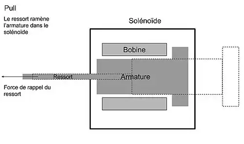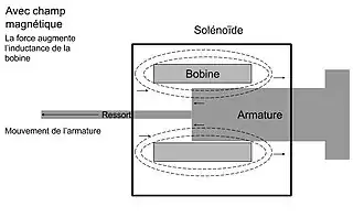 Quand on impose un courant électrique à travers le fil, un champ magnétique est créé. L’intérieur d’un solénoïde est un cylindre mobile de fer ou d’acier appelé sous différents noms : armature, plongeur ou noyau. Le champ magnétique applique donc une force soit attractive soit répulsive sur l’armature. Cette force est proportionnelle au changement d’inductance de la bobine en prenant en compte le changement de position de l’armature et le courant traversant la bobine (Loi de Faraday sur l’induction). La force appliquée déplacera toujours l’armature dans la direction permettant d’augmenter l’inductance de la bobine. Quand on arrête le courant, le champ magnétique s’arrête et un ressort permet au dispositif de reprendre sa position initiale.