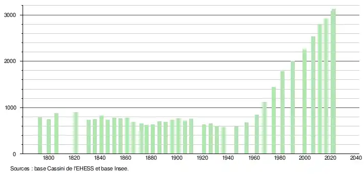 L'évolution du nombre d'habitants est connue à travers les recensements de la population effectués dans la commune depuis 1793. Pour les communes de moins de 10 000 habitants, une enquête de recensement portant sur toute la population est réalisée tous les cinq ans, les populations de référence des années intermédiaires étant quant à elles estimées par interpolation ou extrapolation[11]. Pour la commune, le premier recensement exhaustif entrant dans le cadre du nouveau dispositif a été réalisé en 2006[12].