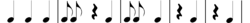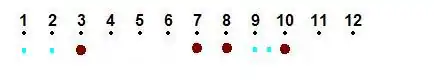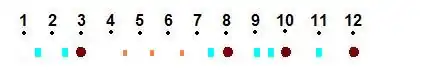 (chaque numéro représente un battement. Les carrés bleus représentent les temps faibles et les points marron les temps forts)