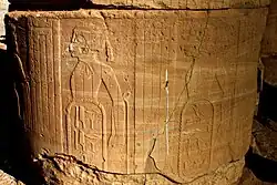 Sur les colonnes de la salle hypostyle, on trouve une liste des peuples que les Égyptiens ont conquis[6]. Au total, trois listes sont conservées avec les noms des lieux étrangers et des peuples survivants[7]. Chaque liste représente la figure d'un soldat prisonnier avec les bras liés et avec son bouclier. Sur chaque bouclier figure une inscription décrivant la ville et le lieu d'appartenance du soldat.