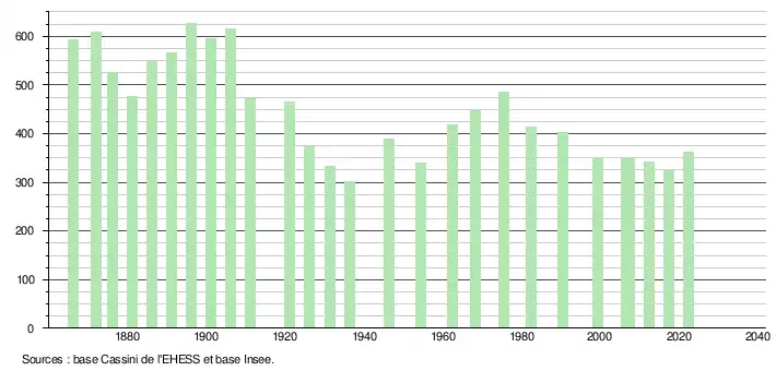 | L'évolution du nombre d'habitants est connue à travers les recensements de la population effectués dans la commune depuis 1866. Pour les communes de moins de 10 000 habitants, une enquête de recensement portant sur toute la population est réalisée tous les cinq ans, les populations de référence des années intermédiaires étant quant à elles estimées par interpolation ou extrapolation[27]. Pour la commune, le premier recensement exhaustif entrant dans le cadre du nouveau dispositif a été réalisé en 2007[28]. En 2022, la commune comptait 361 habitants[Note 1], en évolution de +8,73 % par rapport à 2016 (Landes : +5,78 %, France hors Mayotte : +2,11 %). |