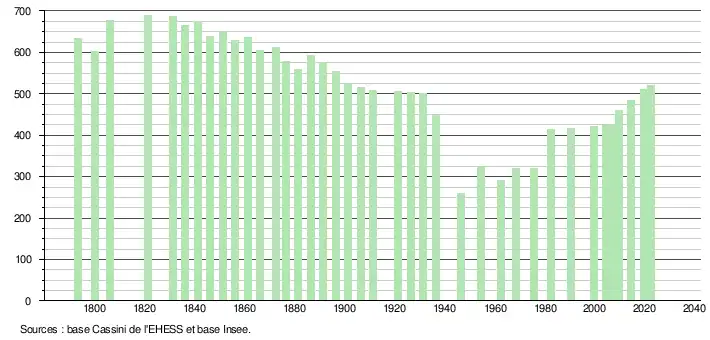 L'évolution du nombre d'habitants est connue à travers les recensements de la population effectués dans la commune depuis 1793. Pour les communes de moins de 10 000 habitants, une enquête de recensement portant sur toute la population est réalisée tous les cinq ans, les populations de référence des années intermédiaires étant quant à elles estimées par interpolation ou extrapolation[19]. Pour la commune, le premier recensement exhaustif entrant dans le cadre du nouveau dispositif a été réalisé en 2004[20].