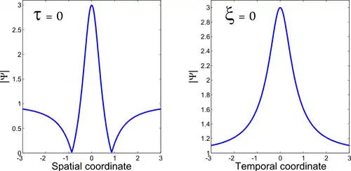 avec coordonnée spatiale et coordonnée temporelle. représentant l'enveloppe d'une onde de surface se propageant en eau profonde. La dispersion est considérée anormale et la non-linéarité autofocalisante.