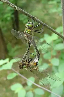 La durée de l'accouplement peut aussi varier considérablement selon les espèces, elle se situe en général entre un quart d'heure et une heure (ou même plus). Les hamuli d'accouplement du mâle sont accrochés à la plaque subgénitale de la femelle, tandis que le « pénis » est introduit entre les deux parties de la plaque subgénitale, et le sperme est poussé par des mouvements de pompe dans l'ouverture génitale de la femelle. Après l'accouplement, les parties génitales se séparent, et, une ou deux secondes après, la prise en tandem se relâche, avant que l'un des partenaires ne s'envole, tandis que l’autre reste encore un petit moment sur le lieu de l'accouplement[17].