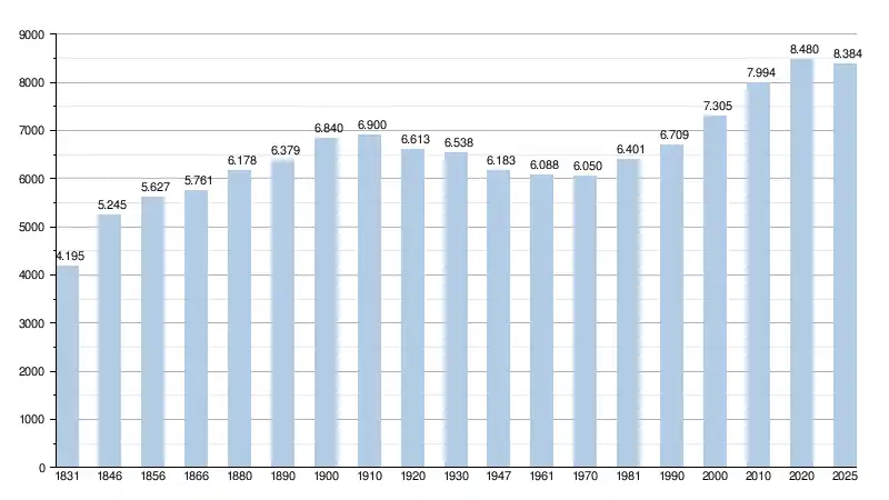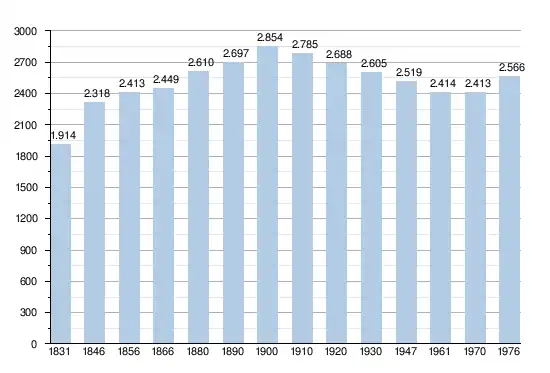 Les chiffres des années 1831 à 1970 tiennent compte des chiffres des anciennes communes fusionnées.