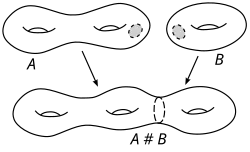 En dimension 2 par exemple, la somme connexe de deux surfaces abstraites est obtenue par découpage d'un disque sur chacune et recollement le long des deux bords circulaires obtenus.