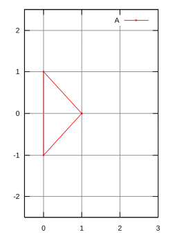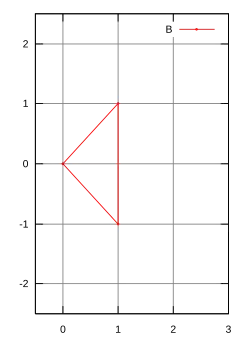 L'ensemble de A à gauche est un triangle dont les coordonnées des sommets sont (0,-1), (0,1) et (1,0). À droite est illustré un triangle semblable B, orienté différemment. Les coordonnées sont (0,0), (1,-1) et (1,1). Si les ensembles A et B sont deux triplets, on trouve :