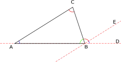 Les angles ACB, CBE sont égaux comme alternes-internes par rapport aux parallèles AC, BE et à la sécante BC ; les angles CAB, EBD sont aussi égaux comme correspondants par rapport aux mêmes parallèles et à la sécante AB. Donc, la somme des trois angles ABC, ACB, CAB du triangle est égale à la somme des trois angles adjacents ABC, CBE, EBD formés sur la ligne droite AD, c'est-à-dire qu'elle est égale à deux angles droits.
