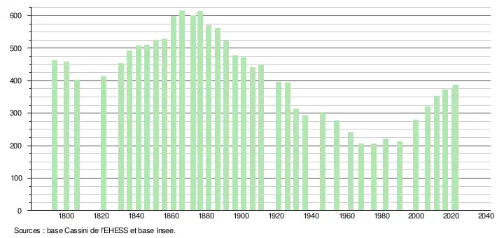 L'évolution du nombre d'habitants est connue à travers les recensements de la population effectués dans la commune depuis 1793. Pour les communes de moins de 10 000 habitants, une enquête de recensement portant sur toute la population est réalisée tous les cinq ans, les populations de référence des années intermédiaires étant quant à elles estimées par interpolation ou extrapolation[18]. Pour la commune, le premier recensement exhaustif entrant dans le cadre du nouveau dispositif a été réalisé en 2006[19].