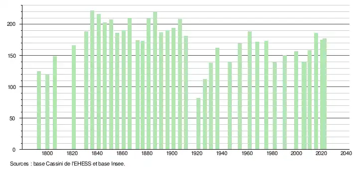 L'évolution du nombre d'habitants est connue à travers les recensements de la population effectués dans la commune depuis 1793. Pour les communes de moins de 10 000 habitants, une enquête de recensement portant sur toute la population est réalisée tous les cinq ans, les populations de référence des années intermédiaires étant quant à elles estimées par interpolation ou extrapolation[28]. Pour la commune, le premier recensement exhaustif entrant dans le cadre du nouveau dispositif a été réalisé en 2005[29].