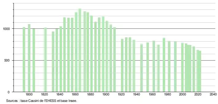 L'évolution du nombre d'habitants est connue à travers les recensements de la population effectués dans la commune depuis 1793. Pour les communes de moins de 10 000 habitants, une enquête de recensement portant sur toute la population est réalisée tous les cinq ans, les populations de référence des années intermédiaires étant quant à elles estimées par interpolation ou extrapolation[25]. Pour la commune, le premier recensement exhaustif entrant dans le cadre du nouveau dispositif a été réalisé en 2004[26].