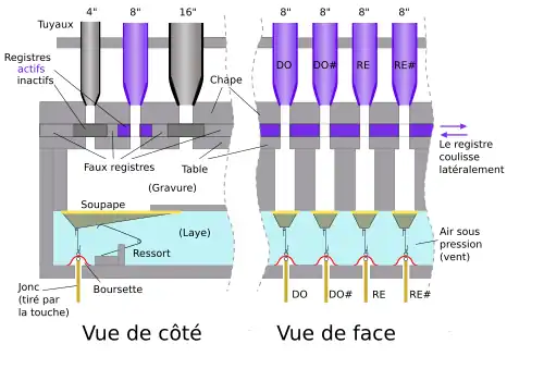 - par les registres, planchettes de bois allongées et percées de trous qui coulissent sur la table, perpendiculairement à la gravure ; en actionnant un registre, soit tiré, soit poussé, on met simultanément en ou hors fonction tous les tuyaux d'un même jeu.
