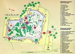 Plusieurs bâtiments de forme rectangulaire et semi-circulaire attendent encore d'être fouillés. Une salle hypostyle est visible près du mur nord.
