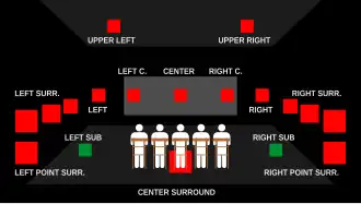 - le 7.1 Dolby Surround : trois enceintes frontales, deux latérales et deux à l'arrière et un caisson de basse (depuis 2010), déployé dans de nombreuses salles de cinéma numérique ;