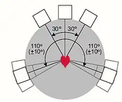 Cinq enceintes entourent l'auditeur, accompagnées d’un subwoofer (le .1) qui diffuse les fréquences graves. Les cinq enceintes doivent être sur le même plan horizontal et identiques. Le subwoofer, alimenté par le canal LFE, est disposé le plus couramment devant, proche de l'enceinte centrale, sa bande-passante doit rester inférieure à 120 hertz. La disposition des enceintes est défini par l'UIT-R BS 775-1.