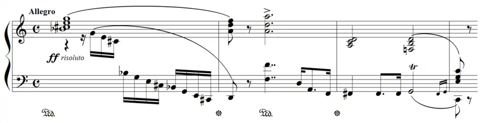 L'Allegro initial débute « par un saisissant accord de septième diminuée (si