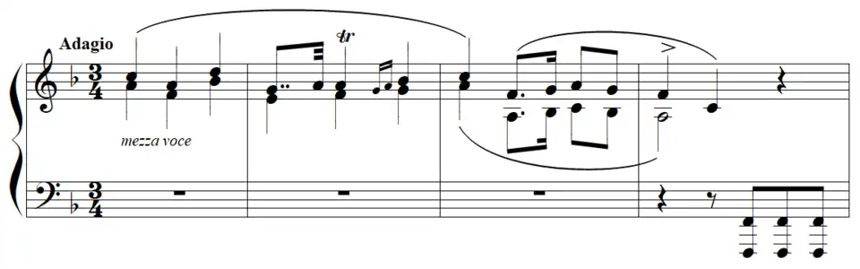 L'Adagio « s'ouvre sereinement par quelques mesures qui s'amplifient rapidement dans un climat de mélancolie et d'émotion[6] » :