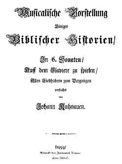 On désigne habituellement par « Sonates bibliques » six pièces pour clavecin ou orgue de Johann Kuhnau, dont le recueil a été publié en 1700 et dont le titre exact est Musicalische Vorstellung einiger Biblischer Historien (en français : Représentation musicale de quelques histoires bibliques). Et la page de titre continue (comme c'est souvent l'usage de l'époque) ainsi : « en 6 sonates à jouer au clavier, proposées par Johann Kuhnau pour l'amusement de tous les amateurs. »
