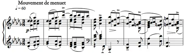 Le deuxième mouvement est un menuet en ré bémol majeur, « aussi archaïsant que le Menuet antique » composé en 1895[17], « dans ses cadences, son emploi de la dominante mineure (mode éolien), mais plus fidèle à la rythmique ancienne, avec son monnayage du ![]()