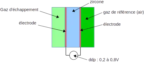 La sonde lambda mesure la différence de potentiel entre la face de la zircone en contact avec les gaz d'échappement, et la face en contact avec un gaz de référence (de l'air). Deux électrodes en platine permettent de mesurer la différence de potentiel. Ces électrodes sont poreuses pour permettre au dioxygène d'atteindre la surface de la zircone. On peut ainsi calculer la concentration en oxygène dans les gaz d'échappement. Une différence de potentiel faible (environ 0,2 V) correspond à une concentration en dioxygène dans les gaz d'échappement assez élevée (rapport de mélange élevé correspondant à un mélange pauvre en combustible, peu polluant), alors qu'une différence de potentiel plus élevée (environ 0,8 V) montre que la concentration en dioxygène est très faible (rapport de mélange faible correspondant à un mélange riche, combustion incomplète).