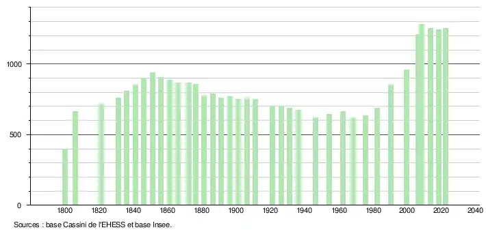 L'évolution du nombre d'habitants est connue à travers les recensements de la population effectués dans la commune depuis 1800. Pour les communes de moins de 10 000 habitants, une enquête de recensement portant sur toute la population est réalisée tous les cinq ans, les populations de référence des années intermédiaires étant quant à elles estimées par interpolation ou extrapolation[18]. Pour la commune, le premier recensement exhaustif entrant dans le cadre du nouveau dispositif a été réalisé en 2008[19].
