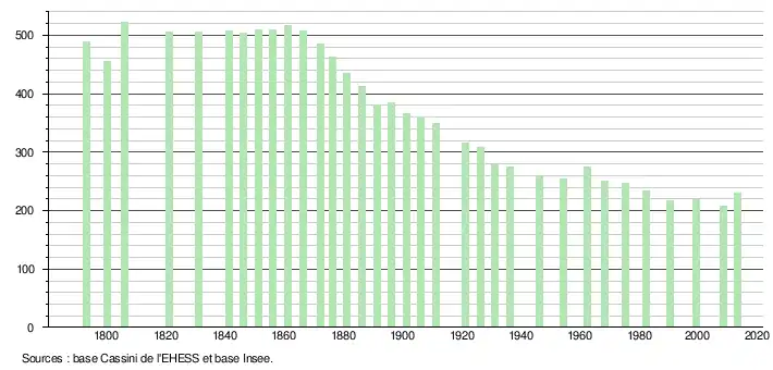 L'évolution du nombre d'habitants est connue à travers les recensements de la population effectués dans la commune depuis 1793. À partir du , les populations légales des communes sont publiées annuellement dans le cadre d'un recensement qui repose désormais sur une collecte d'information annuelle, concernant successivement tous les territoires communaux au cours d'une période de cinq ans. Pour les communes de moins de 10 000 habitants, une enquête de recensement portant sur toute la population est réalisée tous les cinq ans, les populations légales des années intermédiaires étant quant à elles estimées par interpolation ou extrapolation[17]. Pour la commune, le premier recensement exhaustif entrant dans le cadre du nouveau dispositif a été réalisé en 2008[18],[Note 2].