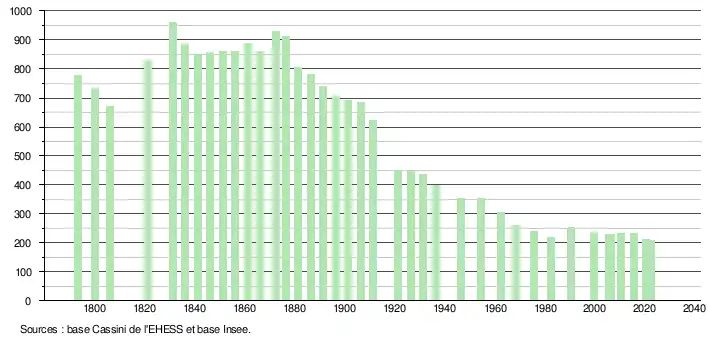 L'évolution du nombre d'habitants est connue à travers les recensements de la population effectués dans la commune depuis 1793. Pour les communes de moins de 10 000 habitants, une enquête de recensement portant sur toute la population est réalisée tous les cinq ans, les populations de référence des années intermédiaires étant quant à elles estimées par interpolation ou extrapolation[20]. Pour la commune, le premier recensement exhaustif entrant dans le cadre du nouveau dispositif a été réalisé en 2005[21].