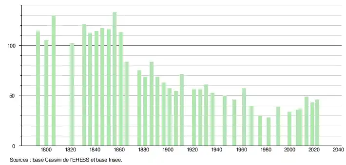 | L'évolution du nombre d'habitants est connue à travers les recensements de la population effectués dans la commune depuis 1793. Pour les communes de moins de 10 000 habitants, une enquête de recensement portant sur toute la population est réalisée tous les cinq ans, les populations de référence des années intermédiaires étant quant à elles estimées par interpolation ou extrapolation[27]. Pour la commune, le premier recensement exhaustif entrant dans le cadre du nouveau dispositif a été réalisé en 2008[28]. En 2022, la commune comptait 46 habitants[Note 3], en évolution de −11,54 % par rapport à 2016 (Hautes-Pyrénées : +1,59 %, France hors Mayotte : +2,11 %). |