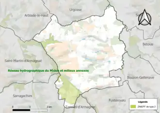 Une ZNIEFF de type 2[Note 1] est recensée sur la commune[12] : le « réseau hydrographique du Midou et milieux annexes » (6 344 ha), couvrant 43 communes dont 37 dans le Gers et six dans les Landes[13].
