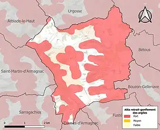 Le retrait-gonflement des sols argileux est susceptible d'engendrer des dommages importants aux bâtiments en cas d’alternance de périodes de sécheresse et de pluie. 70,3 % de la superficie communale est en aléa moyen ou fort (94,5 % au niveau départemental et 48,5 % au niveau national). Sur les 116 bâtiments dénombrés sur la commune en 2019, 53 sont en aléa moyen ou fort, soit 46 %, à comparer aux 93 % au niveau départemental et 54 % au niveau national. Une cartographie de l'exposition du territoire national au retrait gonflement des sols argileux est disponible sur le site du BRGM[17],[Carte 3].