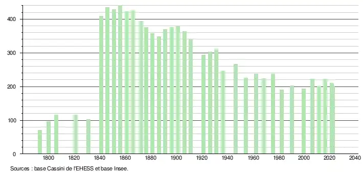 L'évolution du nombre d'habitants est connue à travers les recensements de la population effectués dans la commune depuis 1793. Pour les communes de moins de 10 000 habitants, une enquête de recensement portant sur toute la population est réalisée tous les cinq ans, les populations de référence des années intermédiaires étant quant à elles estimées par interpolation ou extrapolation[20]. Pour la commune, le premier recensement exhaustif entrant dans le cadre du nouveau dispositif a été réalisé en 2006[21].