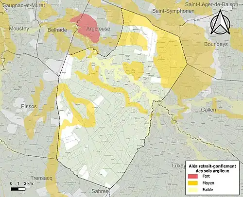 Les communes limitrophes sont Argelouse, Belhade, Bourideys, Callen, Luxey, Pissos, Sabres, Saint-Symphorien et Trensacq.