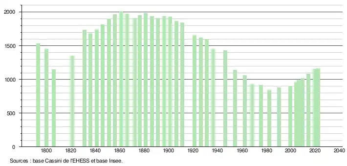 | L'évolution du nombre d'habitants est connue à travers les recensements de la population effectués dans la commune depuis 1793. Pour les communes de moins de 10 000 habitants, une enquête de recensement portant sur toute la population est réalisée tous les cinq ans, les populations de référence des années intermédiaires étant quant à elles estimées par interpolation ou extrapolation[25]. Pour la commune, le premier recensement exhaustif entrant dans le cadre du nouveau dispositif a été réalisé en 2004[26]. En 2022, la commune comptait 1 162 habitants[Note 1], en évolution de +4,97 % par rapport à 2016 (Landes : +5,78 %, France hors Mayotte : +2,11 %). |