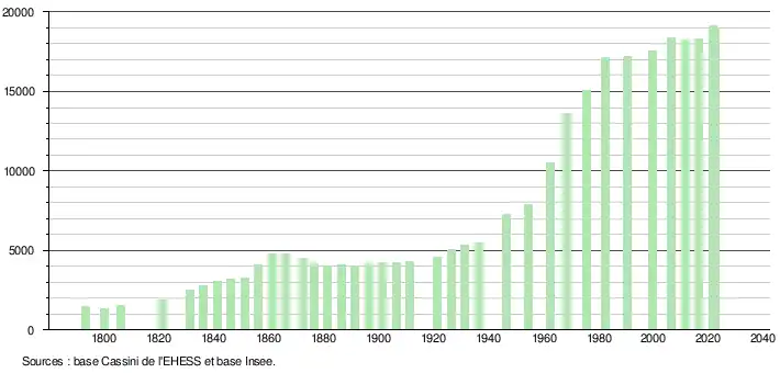 - ↑ Par convention dans Wikipédia, le principe a été retenu de n’afficher dans le tableau des recensements et le graphique, pour les populations de référence postérieures à 1999, que les populations correspondant à une enquête exhaustive de recensement pour les communes de moins de 10 000 habitants, et que les populations des années 2006, 2011, 2016, etc. pour les communes de plus de 10 000 habitants, ainsi que la dernière population de référence publiée par l’Insee pour l'ensemble des communes.