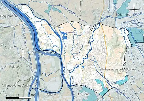 - certains bras aménagés de la Sorgue, à l'est de la ville avant leur confluent dans l’Ouvèze (au nord hors de la commune, à Bédarrides) ;