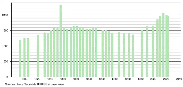 L'évolution du nombre d'habitants est connue à travers les recensements de la population effectués dans la commune depuis 1793. Pour les communes de moins de 10 000 habitants, une enquête de recensement portant sur toute la population est réalisée tous les cinq ans, les populations de référence des années intermédiaires étant quant à elles estimées par interpolation ou extrapolation[21]. Pour la commune, le premier recensement exhaustif entrant dans le cadre du nouveau dispositif a été réalisé en 2005[22].