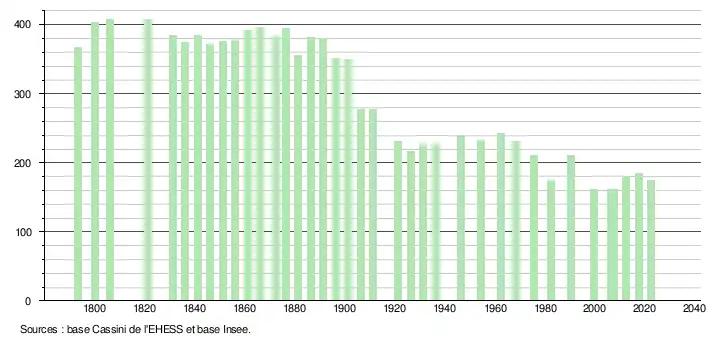 L'évolution du nombre d'habitants est connue à travers les recensements de la population effectués dans la commune depuis 1793. Pour les communes de moins de 10 000 habitants, une enquête de recensement portant sur toute la population est réalisée tous les cinq ans, les populations de référence des années intermédiaires étant quant à elles estimées par interpolation ou extrapolation[20]. Pour la commune, le premier recensement exhaustif entrant dans le cadre du nouveau dispositif a été réalisé en 2007[21].