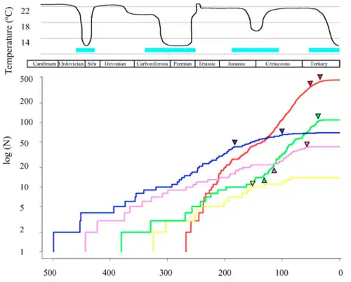 Sur les 31 phyla d'animaux actuels identifiés, tous apparus dans le milieu marin, 12 sont endémiques à ce milieu, 19 ayant conquis les terres[43].