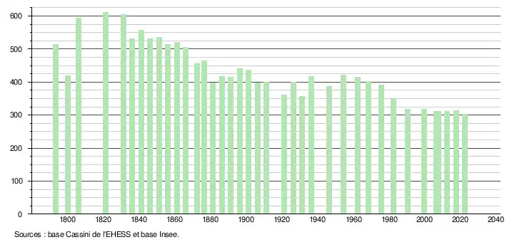 L'évolution du nombre d'habitants est connue à travers les recensements de la population effectués dans la commune depuis 1793. Pour les communes de moins de 10 000 habitants, une enquête de recensement portant sur toute la population est réalisée tous les cinq ans, les populations de référence des années intermédiaires étant quant à elles estimées par interpolation ou extrapolation[41]. Pour la commune, le premier recensement exhaustif entrant dans le cadre du nouveau dispositif a été réalisé en 2007[42].
