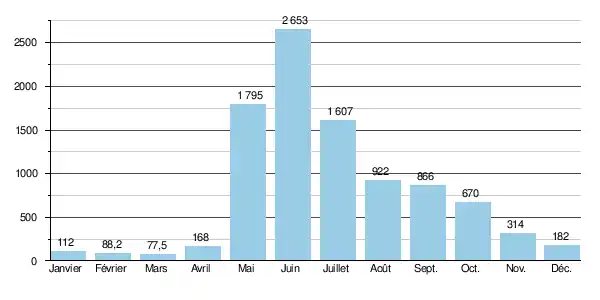 Le débit moyen mensuel observé en mars (minimum d'étiage) est de 77,5 m3/s, soit plus ou moins 3 % du débit moyen du mois de juin (2 653 m3/s), ce qui illustre l'amplitude très élevée des variations saisonnières. Sur la durée d'observation de 42 ans, le débit mensuel minimal a été de 45,1 m3/s en , tandis que le débit mensuel maximal s'élevait à 5 080 m3/s en . Un débit mensuel inférieur à 50 m3/s est relativement exceptionnel.