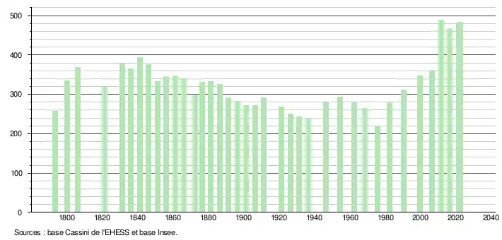 L'évolution du nombre d'habitants est connue à travers les recensements de la population effectués dans la commune depuis 1793. Pour les communes de moins de 10 000 habitants, une enquête de recensement portant sur toute la population est réalisée tous les cinq ans, les populations de référence des années intermédiaires étant quant à elles estimées par interpolation ou extrapolation[29]. Pour la commune, le premier recensement exhaustif entrant dans le cadre du nouveau dispositif a été réalisé en 2006[30].