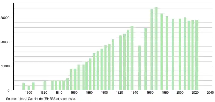 - ↑ Par convention dans Wikipédia, le principe a été retenu de n’afficher dans le tableau des recensements et le graphique, pour les populations de référence postérieures à 1999, que les populations correspondant à une enquête exhaustive de recensement pour les communes de moins de 10 000 habitants, et que les populations des années 2006, 2011, 2016, etc. pour les communes de plus de 10 000 habitants, ainsi que la dernière population de référence publiée par l’Insee pour l'ensemble des communes.