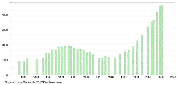 L'évolution du nombre d'habitants est connue à travers les recensements de la population effectués dans la commune depuis 1793. Pour les communes de moins de 10 000 habitants, une enquête de recensement portant sur toute la population est réalisée tous les cinq ans, les populations de référence des années intermédiaires étant quant à elles estimées par interpolation ou extrapolation[23]. Pour la commune, le premier recensement exhaustif entrant dans le cadre du nouveau dispositif a été réalisé en 2008[24].